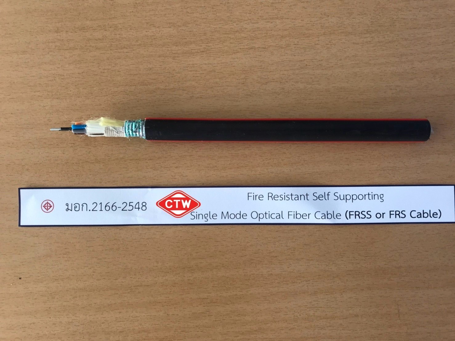 ชื่อทางการค้า: เคเบิลเส้นใยนำแสงทนไฟ แขวนในอากาศรับน้ำหนักตัวเองได้ (Fire Resistant Self - Supporting Optical Fiber Cable : FRSS OFC) |