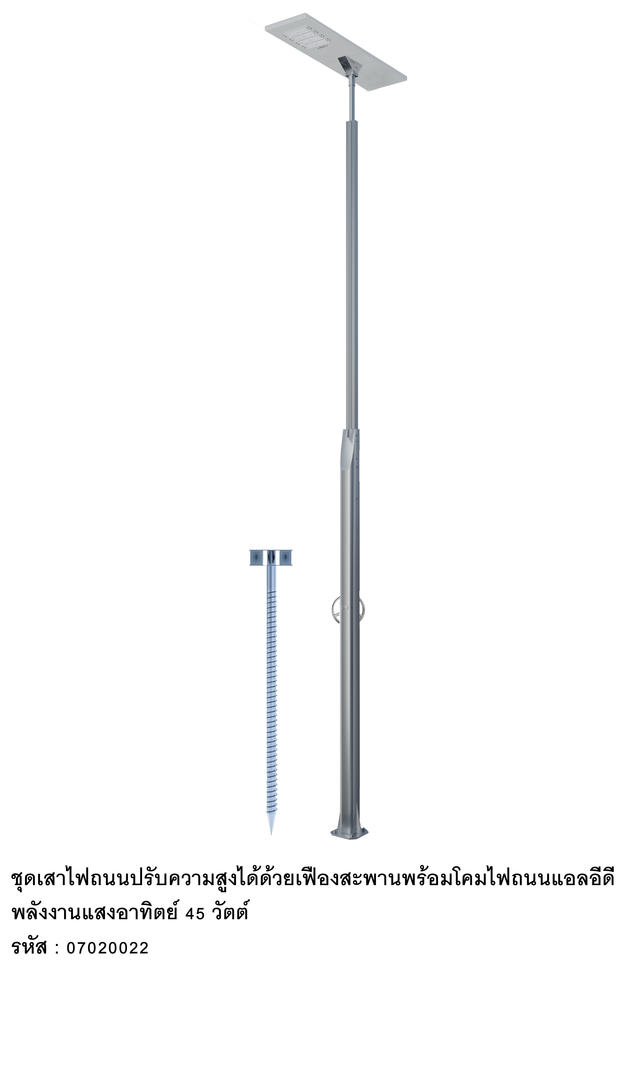 07020042 | ชื่อสามัญ: ชุดโคมไฟถนนแอลอีดีโซล่าเซลล์แบบมีกลไกบังคับเสาพร้อมเสาเข็มปีกเกลียว (Height adjustable pole and screw pile with LED solar cell street light)