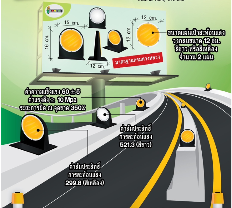 | 1) เป้าสะท้อนแสงยางพารา วงกลม ชนิด 1 หน้า (เป้าสะท้อนแสง มีสีดำ และแผ่นเป้าสะท้อนแสงมีสีเหลืองหรือสีขาว) ขนาด เส้นผ่านศูนย์กลาง 12 เซนติเมตร ฐานขนาดประมาณ กว้าง 7.5 เซนติเมตร ยาว 15 เซนติเมตร สูง 18 เซนติเมตร น้ำหนักประมาณ 0.62 กิโลกรัม พร้อมพุกเหล็ก 4 ตัว เพื่อใช้ในการยึดติดเป้ายางกับขอบฟุตบาท หรือ คันหิน (Curb Stone) หรือขอบสะพาน | 165.00/ชิ้น |